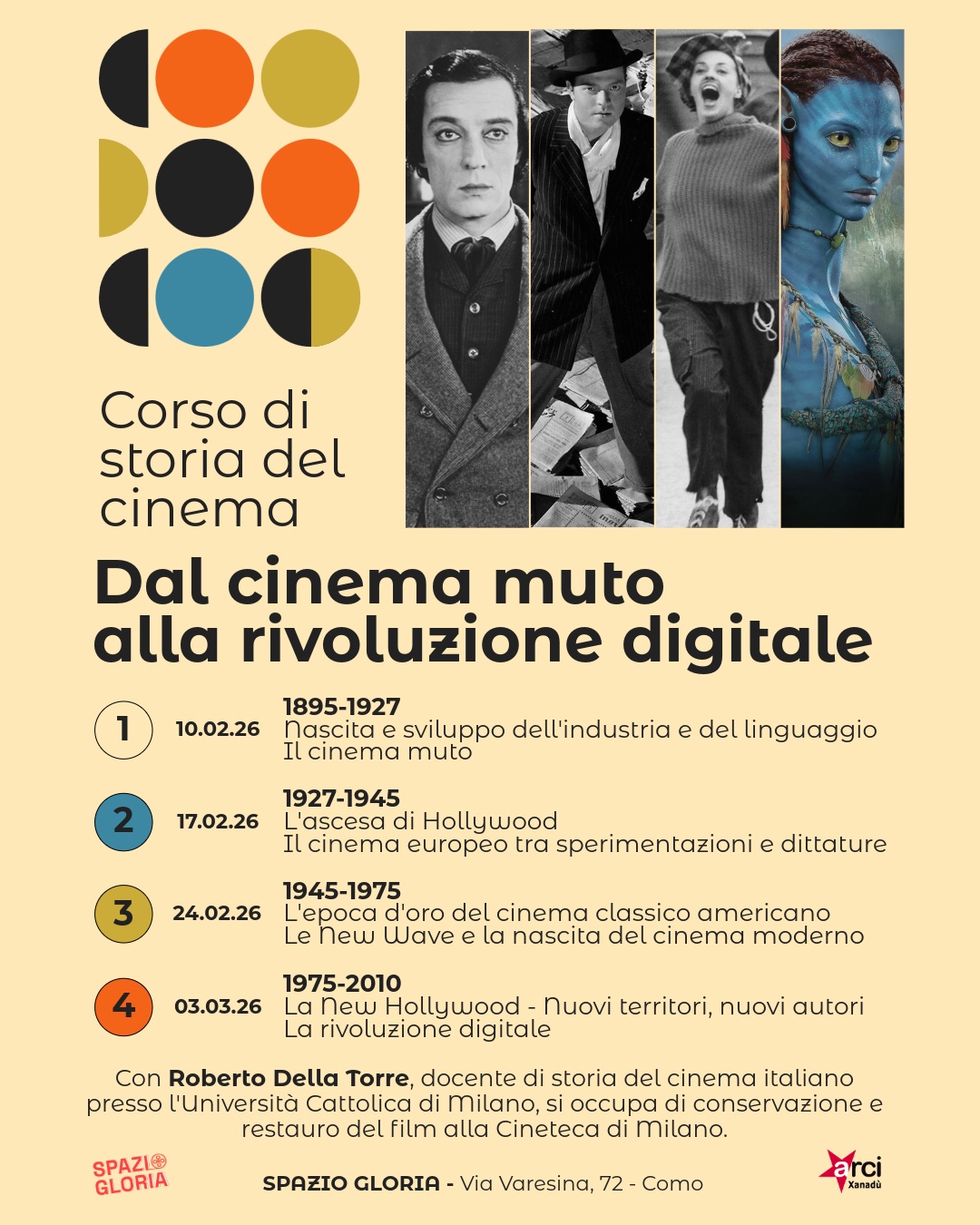 Ritorno con estremo piacere al Circolo Arci Xanadu di Como per un nuovo corso in 4 incontri sulla storia del cinema. Martedì 10 febbraio ore 211895-1927Il cinema mutoNascita e sviluppo dell'industria e del linguaggio cinematografico Martedì 17 febbraio ore 211927-1945L'ascesa... Continue Reading →