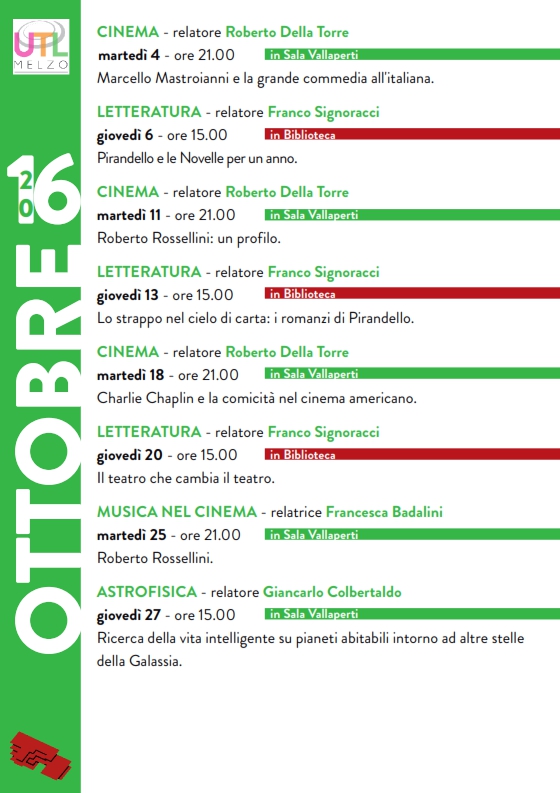 Per il secondo anno consecutivo terrò alcune lezioni all’Università del Tempo Libero di Melzo. Agli appuntamenti sulla storia del linguaggio cinematografico del precedente anno accademico, seguiranno quest’anno degli approfondimenti su alcune personalità del cinema italiano e internazionale: Marcello Mastroianni, Roberto Rossellini e Charlie Chaplin.