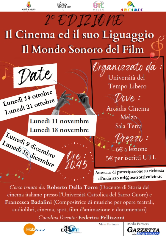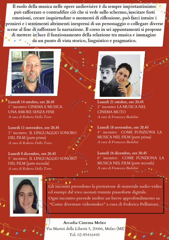 Un corso di storia e linguaggio cinematografico in 6 appuntamenti condiviso con Francesca Badalini sulla relazione tra cinema e musica. Il corso, organizzato da UTL di Melzo con Federica Pellizzoni, si svolgerà dal 14 ottobre al 16 dicembre presso il Cinema Arcadia di Melzo. Tutte le informazioni nel volantino.